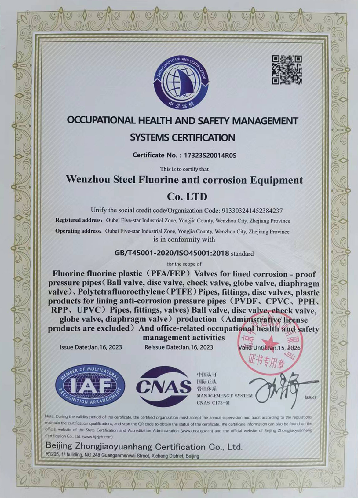 職業健康安全管理體系認證證書 |