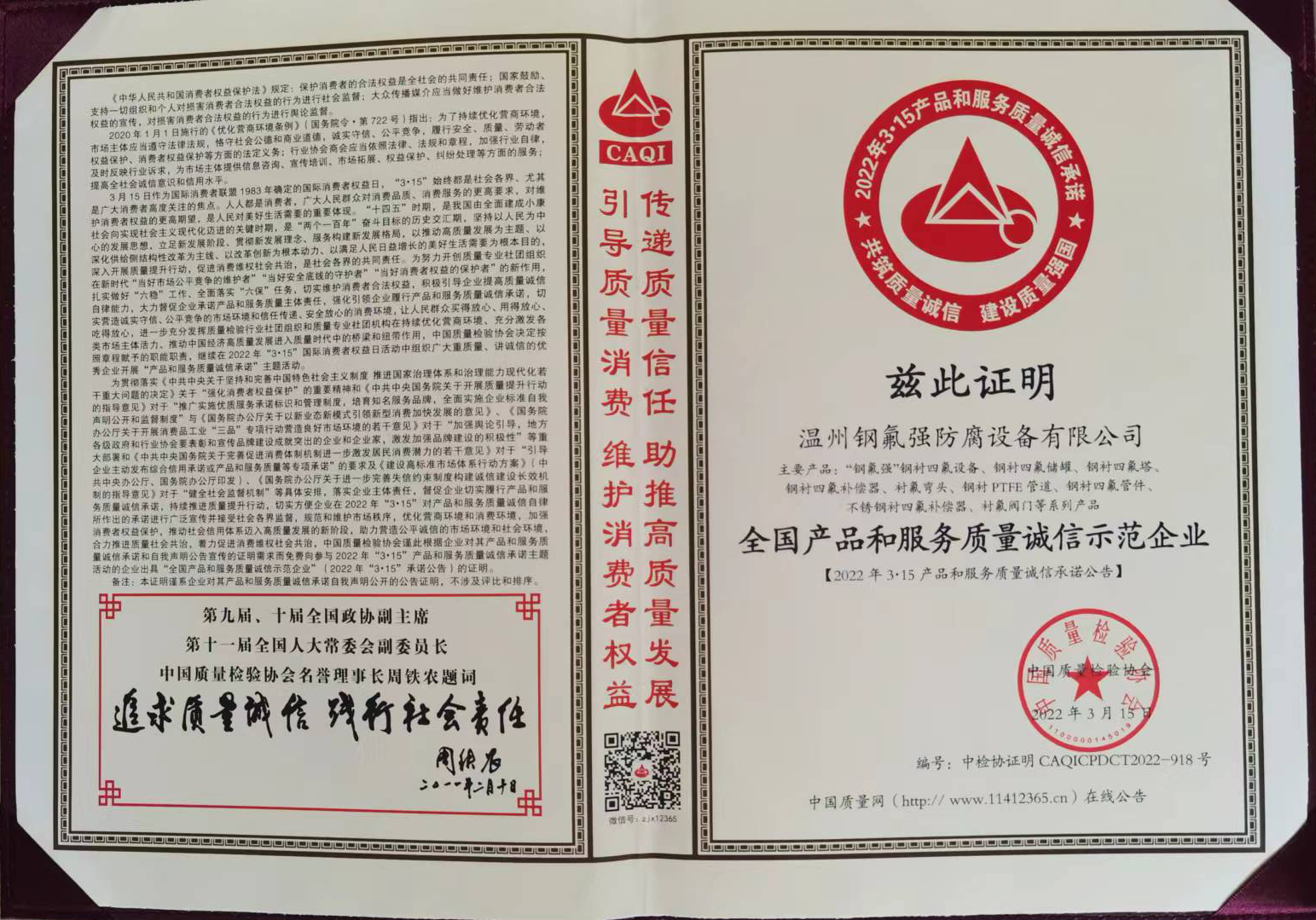 全國產品和服務質量誠信示范企業 全國質量誠信標桿企業